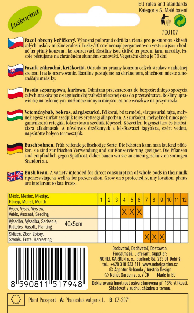 Výnosná poloraná odrůda určená pro postupnou sklizeň celých lusků v mléčné zralosti. Lusky /10cm/ nemají pergamenovou vrstvu a jsou vhodné na přímý konzum i ke konzervaci. Rostliny jsou citlivé na pozdní jarní mrazíky.… Více informací