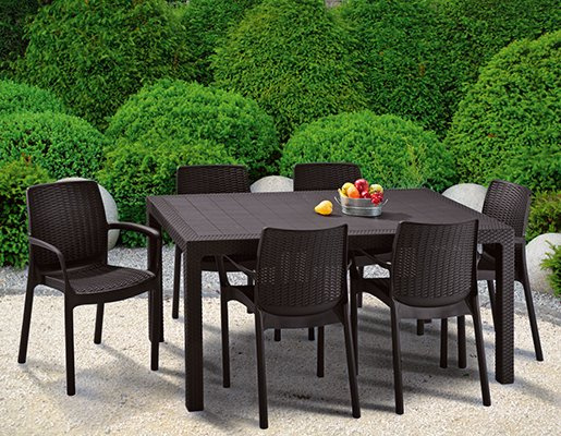 Obdélníkový plastový stůl od firmy KETER. Moderní vzhled - imitace ratanové struktury. Stůl je vhodný k usazení až 6 osob. Stůl je odolný nepřízni počasí i UV záření. Snadná údržba!