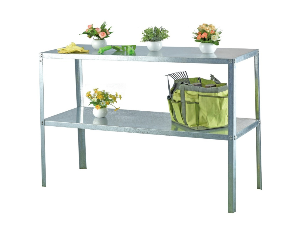 Ocelý dvoupolicový regál z pozinkovaného plechu stojící na zemi. Rozměry regálu jsou d 115 x š 40 x v 80 cm. Vhodné pro skleníky všech typů. Univerzální produkt. Dodáváme v rozebraném stavu jako stavebnici. Více informací