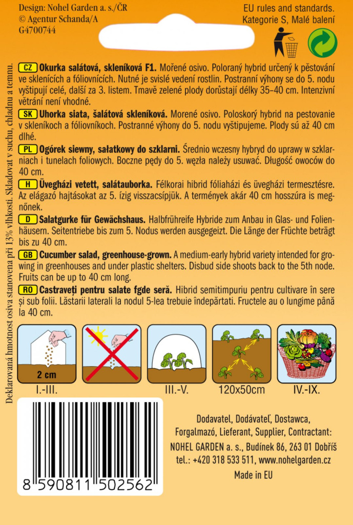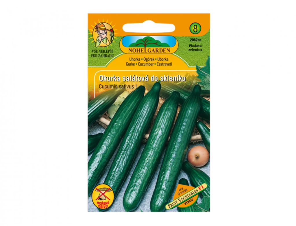 Mořeno Captanem. Poloraný hybrid určený k pěstování ve sklenících a fóliovnících. Nutné je svislé vedení rostlin. Postranní výhony se do 5. nodu vyštipují celé, další za 3. listem. Tmavě zelené plody dorůstají délky 35-40 cm… Více informací