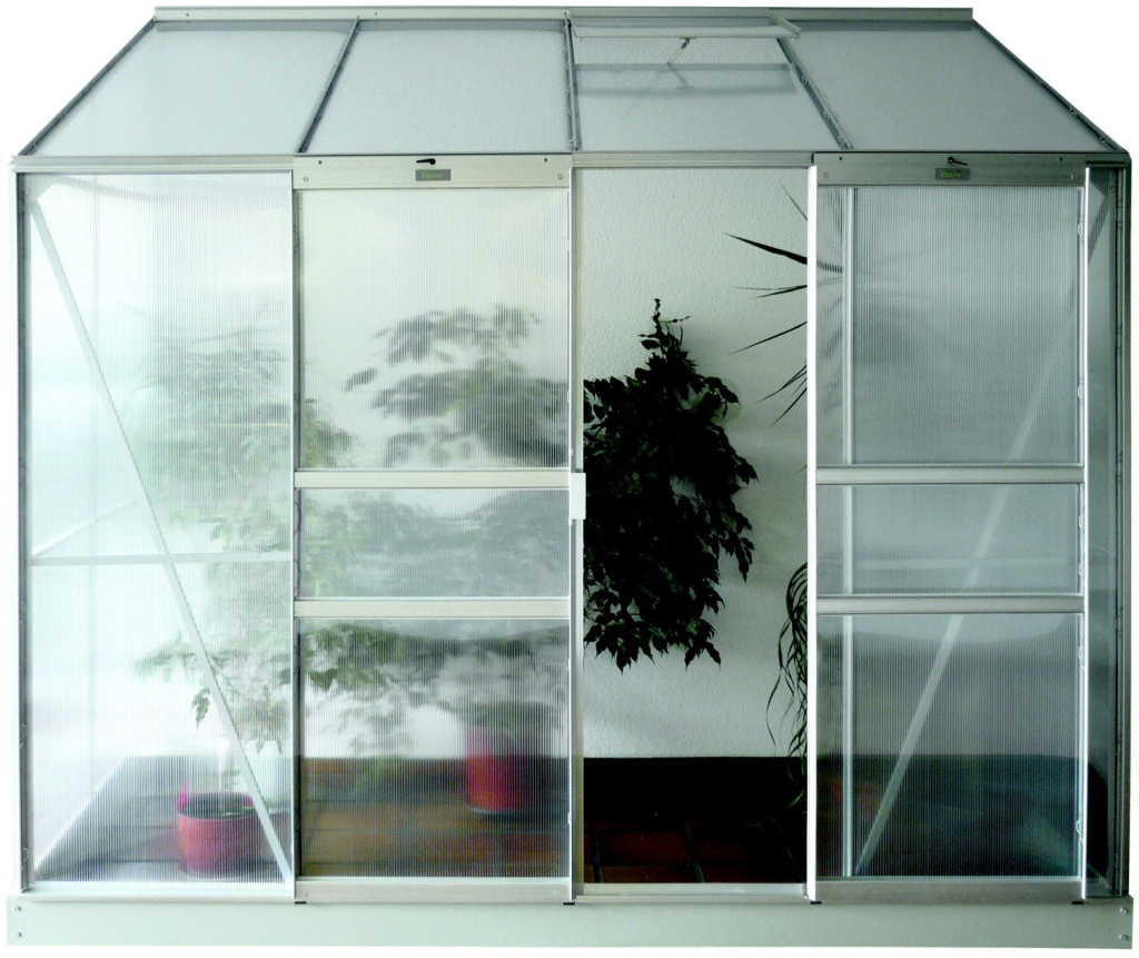Skleník je vybaven dvoukřídlými dveřmi (velikost 1,22 x 1,63 m), AL profily, prosklením, 1x střešním ventilačním okénkem s manuálním otevíráním, veškerým spojovacím materiálem. Skleník lze postavit buď na zděnou podezdívku (pak není nutné dokupovat základnu z pozinkovaného plechu) nebo na základnu z pozinkovaného plechu (nutno dokoupit). Při stavbě bez zděné podezdívky dokoupení základny určitě doporučujeme. Ke skleníku je možné dokoupit řadu nadstandardního příslušenství - poličky, regály, teploměry, vlhkoměry, zavlažovací zařízení, elektrické odporové vytápění půdy.